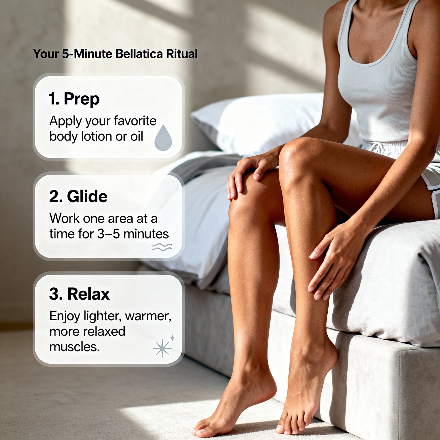 - Glide – “Move Bellatica slowly along the muscle or area for 3–5 minutes.”